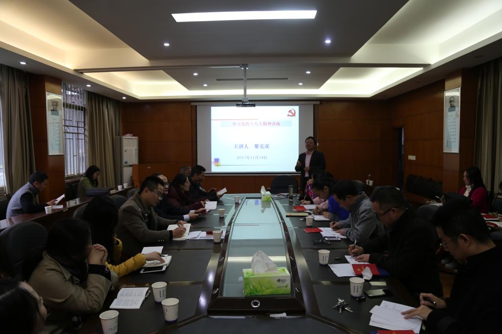 为进一步深入、系统学习和理解“党的十九大”精神,准确把握大会主题,深入理解内涵实质,11月14日下午,党委书记黎克双在院会议室给全体教职工党员,学生支部书记、副书记以及部分党外教职工进行了“党的十九大”精神专题辅导报告。