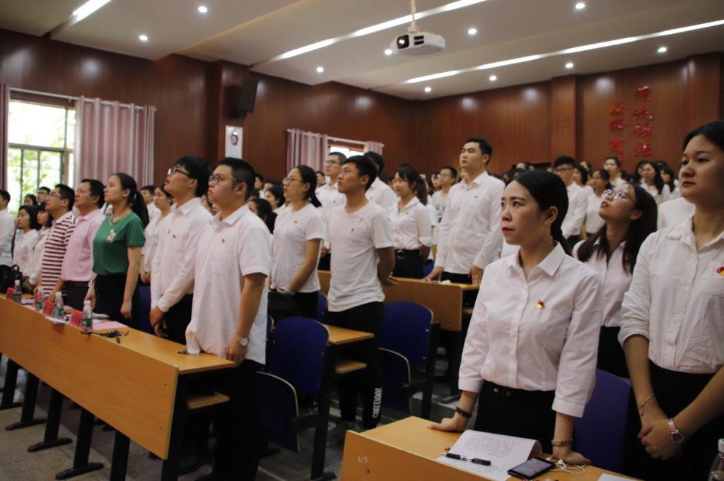 6月5日下午,我院在学院学术报告厅召开预备党员入党宣誓仪式暨毕业生党员教育大会。院党委书记黎克双、副书记胡锦湘、学生党支部书记唐琪、李希聪、袁梓翔出席,杨海铭等83名新发展预备党员、全体学生党员及部分入党积极分子参加,会议由2016级辅导员张湘华主持。