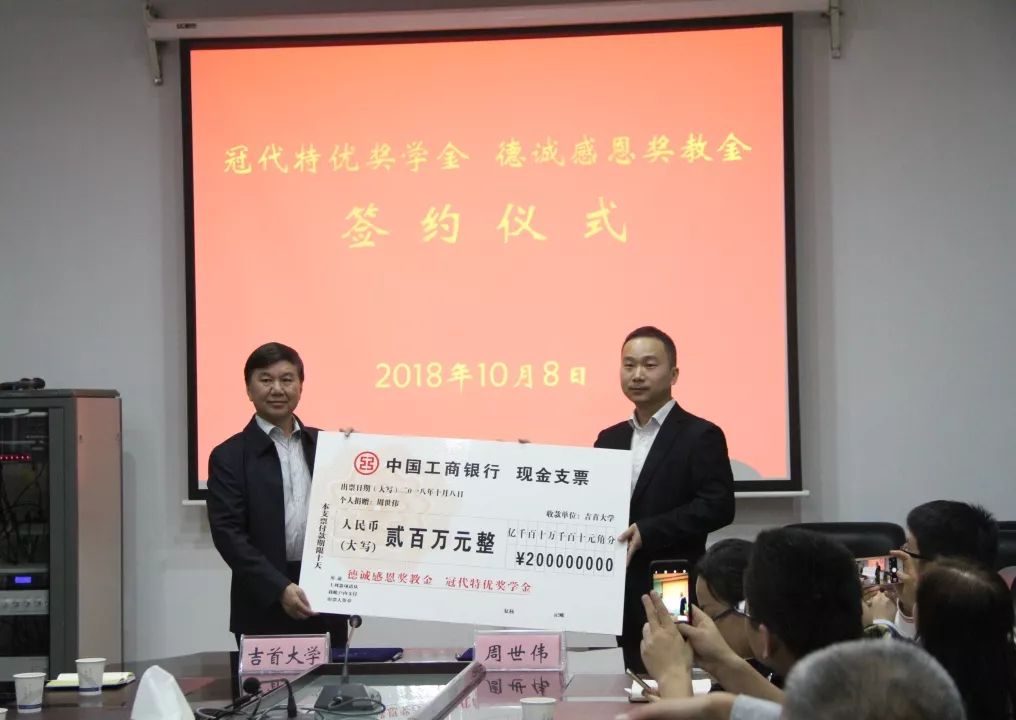 10月8日下午,由我院校友、2001届电算会计本科专业毕业生周世伟先生设立的“冠代特优奖学金”、“德诚感恩奖教金”签约仪式在砂子坳校区凤凰楼二会议室举行。校党委书记游俊,原正校级督导、永利集团304am官方入口校友会会长、基金会理事长张建永,校党委委员、副校长冷志明以及吉首校区各职能部门领导、各学院分管学生工作的书记、辅导员代表、学生代表等参加了签约仪式。